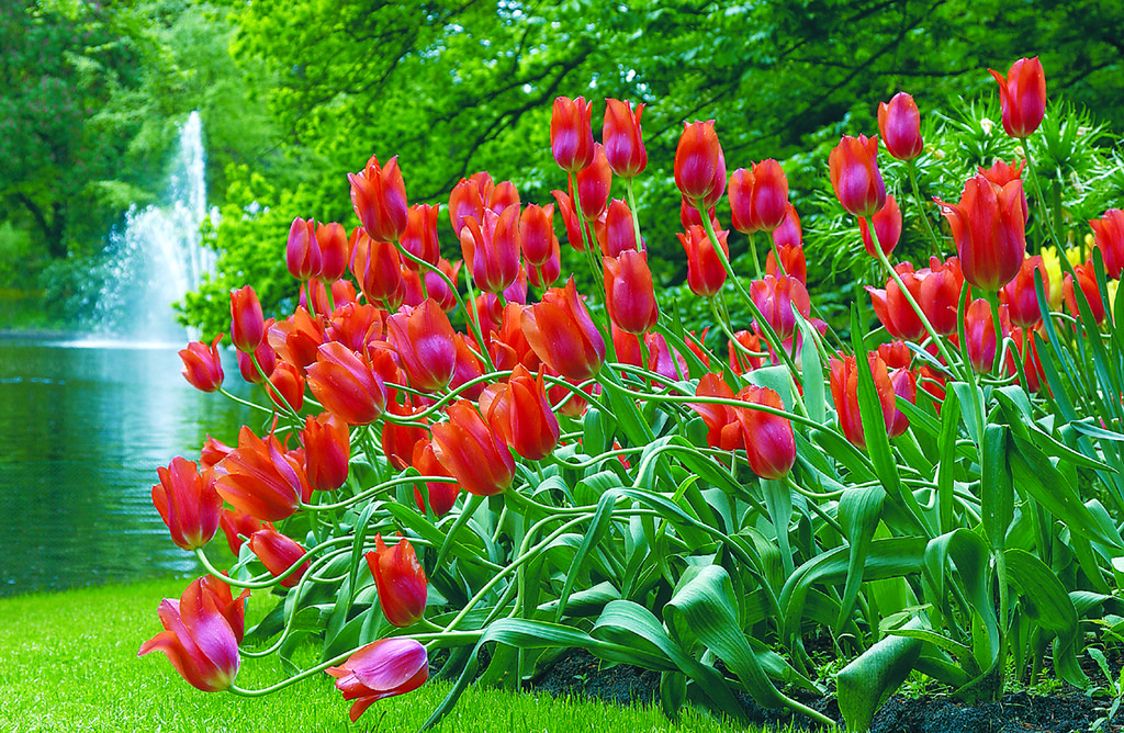 Offerts par des producteurs hollandais, les bulbes sont plantés à la main en novembre, retirés à la fin du printemps et conservés pour l’année suivante. Les massifs sont imaginés par des architectes qui en dessinent les plans un an à l’avance.