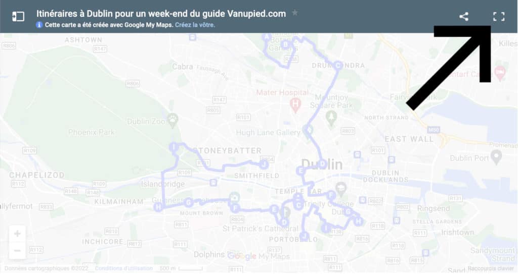 - Depuis votre téléphone / tablette, cliquer sur le « carré » en haut à droite à côté, cela ouvrira la carte dans Google Map.